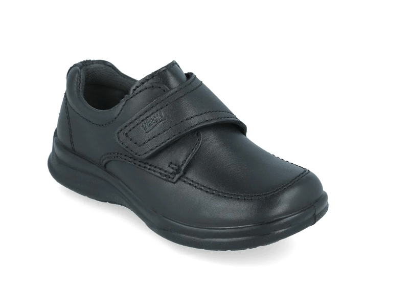 Zapato escolar de piel lisa negra de punta cuadrada y amarre mediante velcro central. Detalles textiles en bullón del tobillo. Adorno de pespuntes decorativos. Forro y plantilla de suave piel natural de cerdo. Suela negra. Comodísimo para los niños que prefieren no abrochar agujetas.